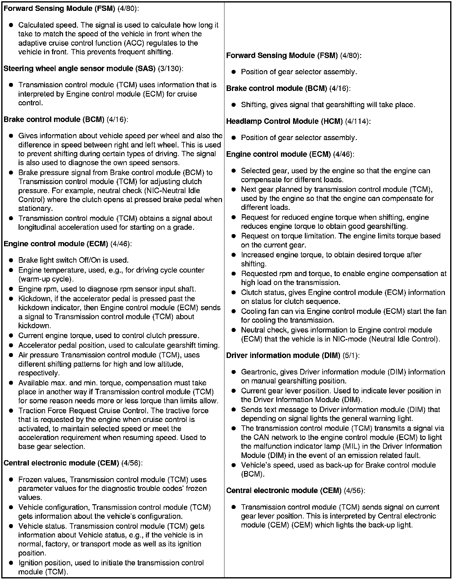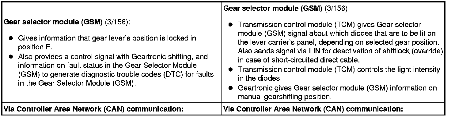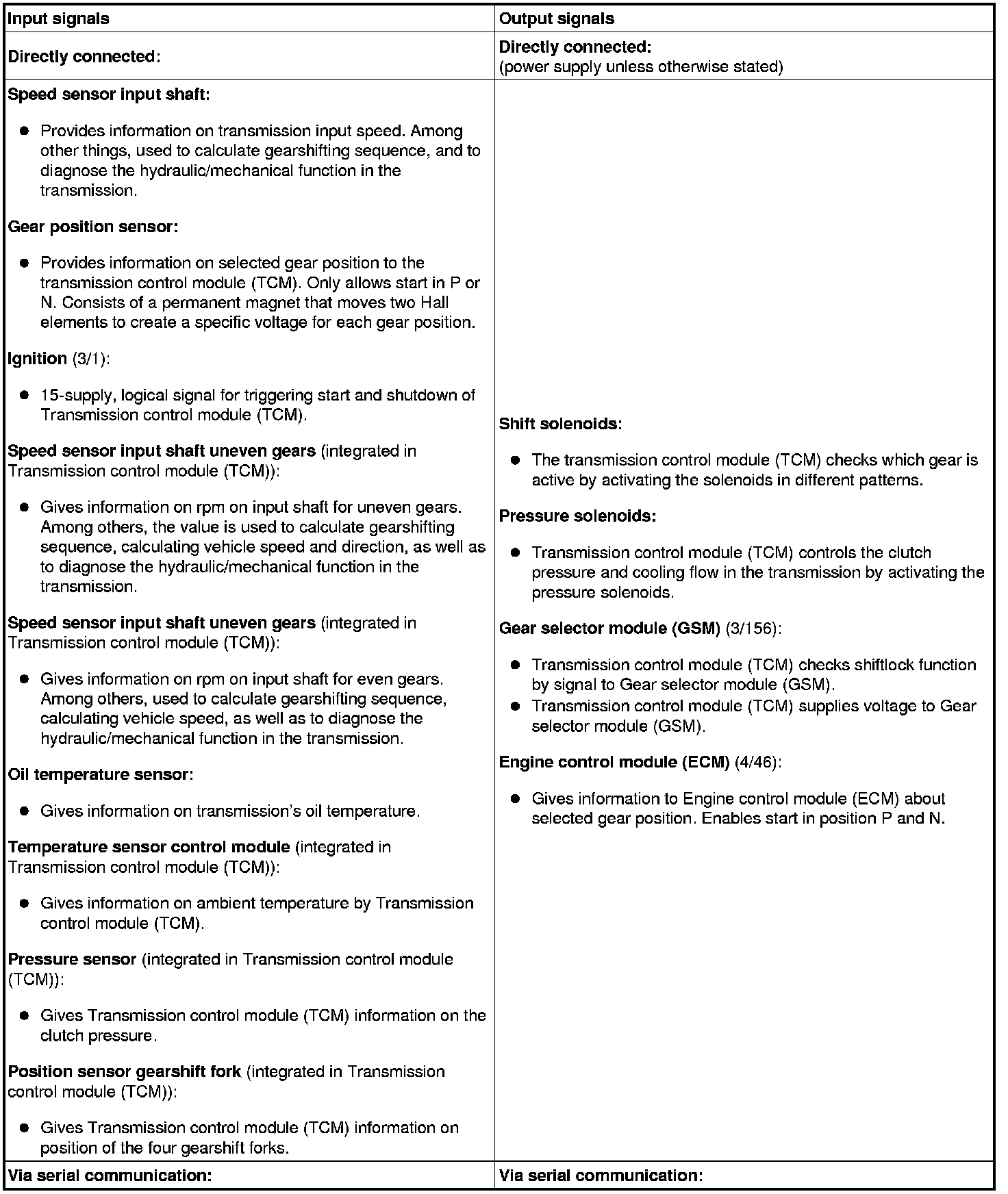 The table below summarizes the input and output signals to and from the transmission control module (TCM). The signal types are divided into directly connected signals, serial communication and CAN communication. The illustration below displays the same information with Volvo component designations.