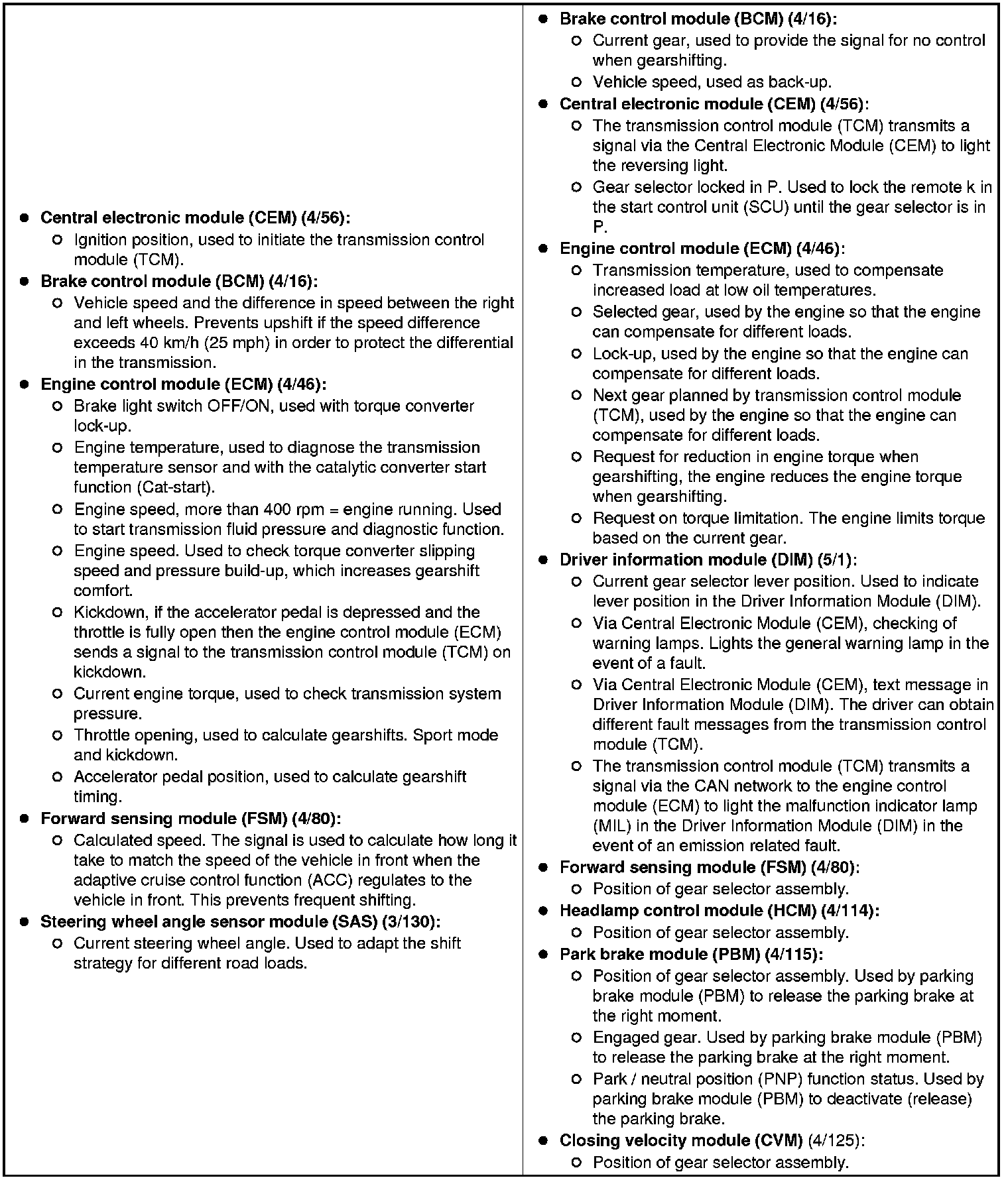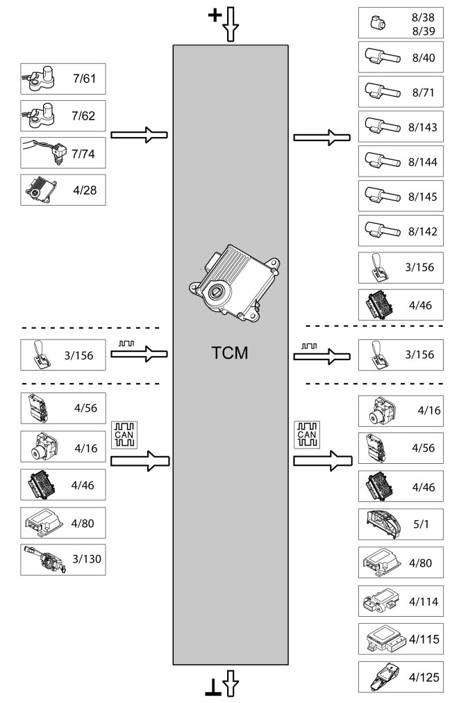 The table below summarizes the input and output signals to and from the transmission control module (TCM). The signal types are divided into directly connected signals, serial communication and CAN communication. The illustration below displays the same information with Volvo component designations.