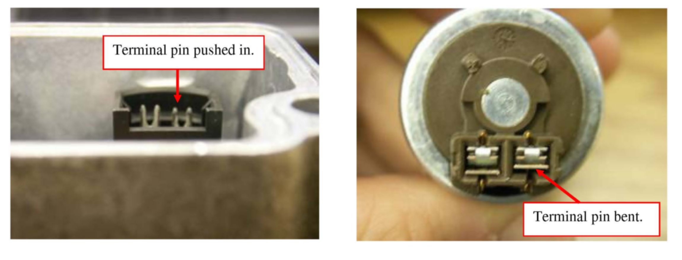 Replace the Differential Electronic Module (DEM) and download a DEM reload per VIDA. A replacement DEM comes with a replacement pressure modulator. It is important to note the orientation of the pressure modulator when installing the new DEM. Incorrectly installing the pressure modulator can damage the connector terminals on the pressure modulator and on the DEM. This can cause an interruption in All Wheel Drive (AWD) and lead the technician to chase falsely-set DTCs. The photos show common results of an incorrectly installed pressure modulator.