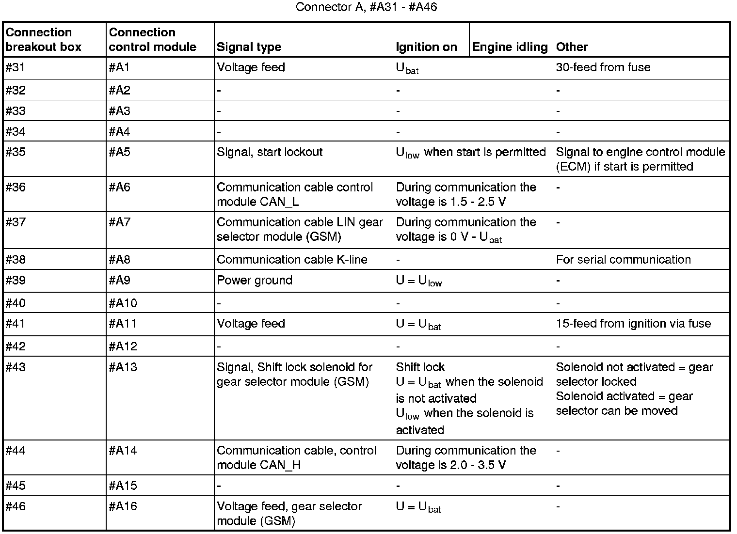 All values indicated below are between respective connection in column 1 and #A9 (#39 on the breakout box). If this is not the case, it is indicated within brackets.