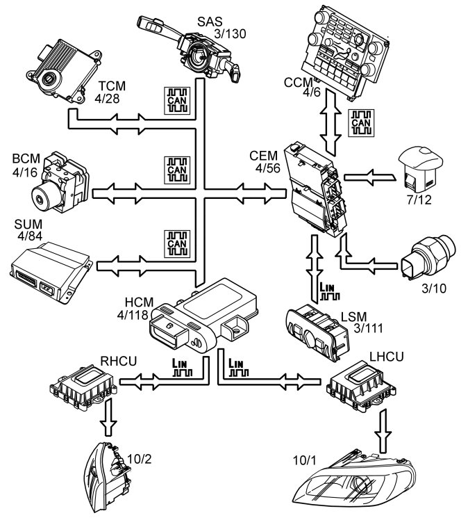 When the function is active, the headlamp control module (HCM) receives continual information on vehicle speed and steering angle. Vehicle speed is obtained from the brake control module (BCM) while steering angle information comes from the steering wheel angle sensor module (SAS) (3/130). This information enables the headlamp control module (HCM) to calculate the current turn-out of the light beam.