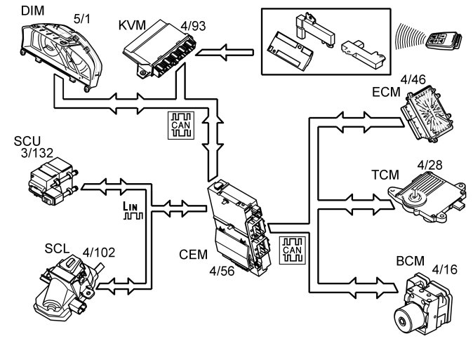 If a passive remote key is not registered, the keyless vehicle module (KVM) will transmit a negative response to the central electronic module (CEM). The central electronic module (CEM) will then transmit a request to the start control module (SCU) (3/132) instead to search for a transponder. The central electronic module (CEM) will approve the remote key if a transponder is found.
