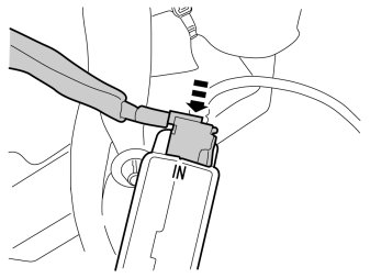 - Connect the previously disconnected cable terminal on the cable from the media player's receptacle housing to IN on the TMC unit.