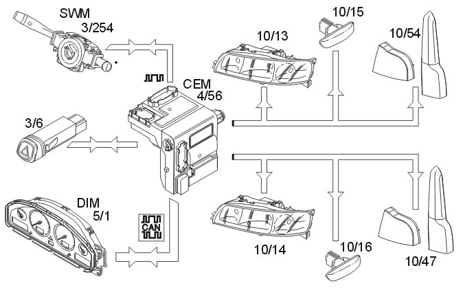 The lamps are supplied with power via a relay which is activated by the central electronic module (CEM). The front parking lamps have a direct power supply.