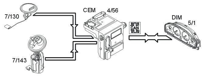 The fuel level is gauged by the fuel level sensors (7/130, 7/143). The signals from the sensors are transmitted to the central electronic module (CEM) (4/56). The central electronic module (CEM) calculates the remaining quantity of fuel by comparing the signals with a tank table stored internally. Information about the quantity of fuel is transmitted via the Control area network (CAN) to the driver information module (DIM) (5/1), where the fuel level is displayed on the fuel gauge.