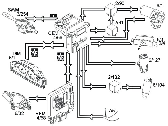 The right-hand control stalk is moved downwards through three positions to operate the windshield wipers. The steering wheel module (SWM) (3/254) transmits information to the central electronic module (CEM) (4/56) about the selected position using serial communication. The central electronic module (CEM) then activates the relay which supplies the wiper motor (6/1) with power in position 1. If high speed wiping is selected, the relay is also activated to power the motor in position 2.