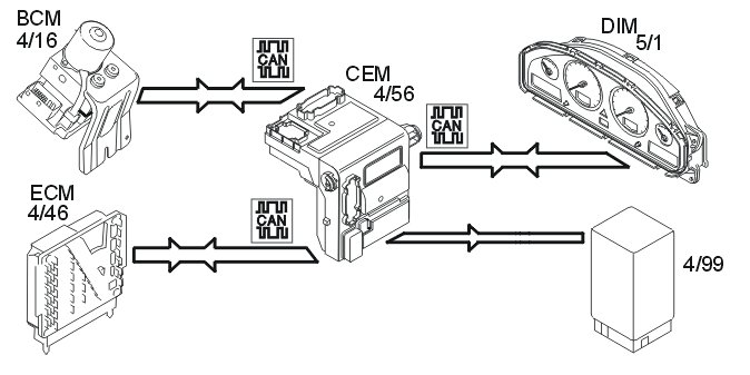 If a fault is detected by the central electronic module (CEM), a diagnostic trouble code (DTC) is stored and a signal is transmitted via the CAN network to the driver information module (DIM), which turns on a general warning lamp and displays a text message.