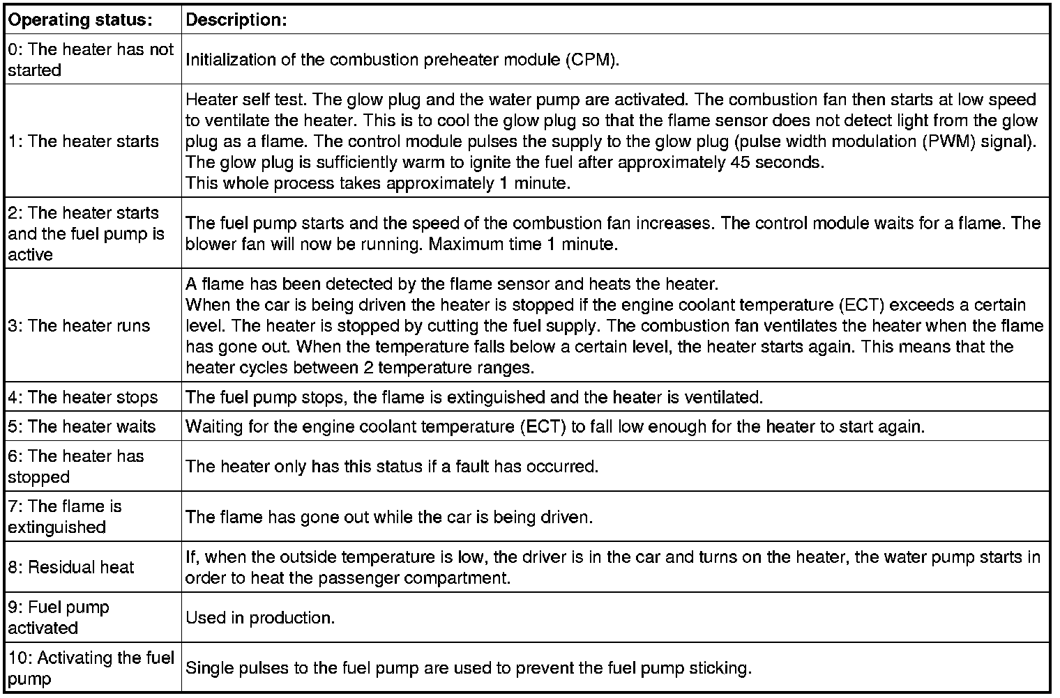 The heater can have a number of different statuses. Each status and what should occur in it is described below.