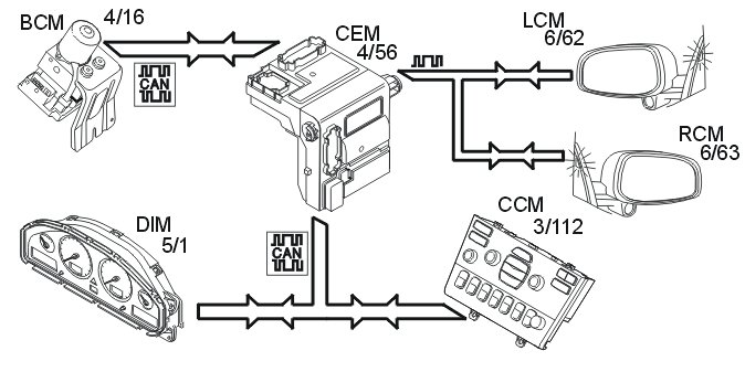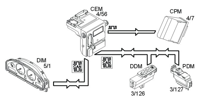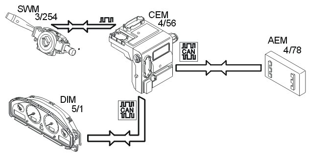 The central electronic module (CEM) (4/56) receives data about when the driver wants to drive from the control stalk module (steering wheel module (SWM)) (3/254) and the driver information module (DIM).
