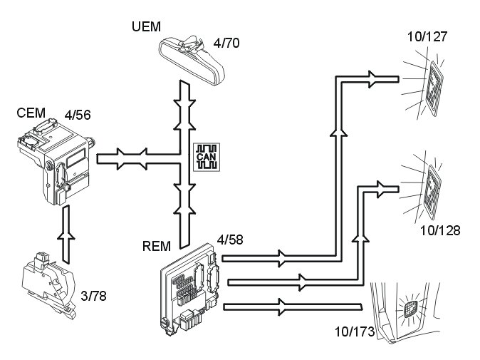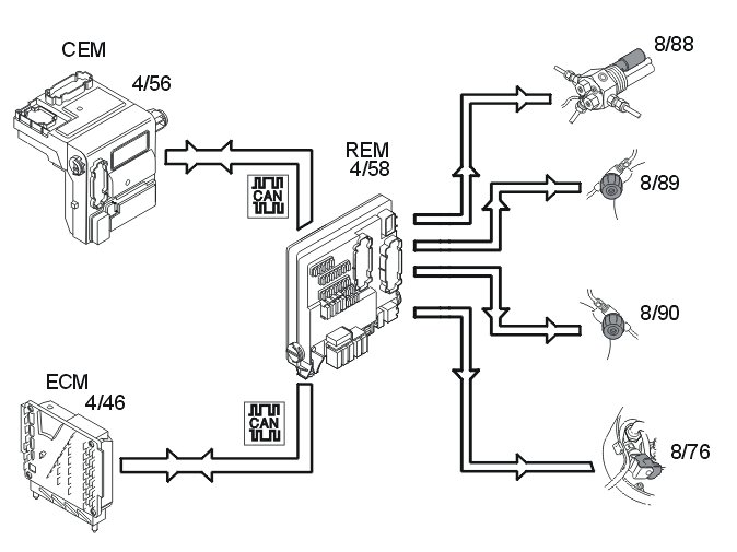 The central electronic module (CEM) transmits the data via the controller area network (CAN) to the rear electronic module (REM) which activates the lamps.
