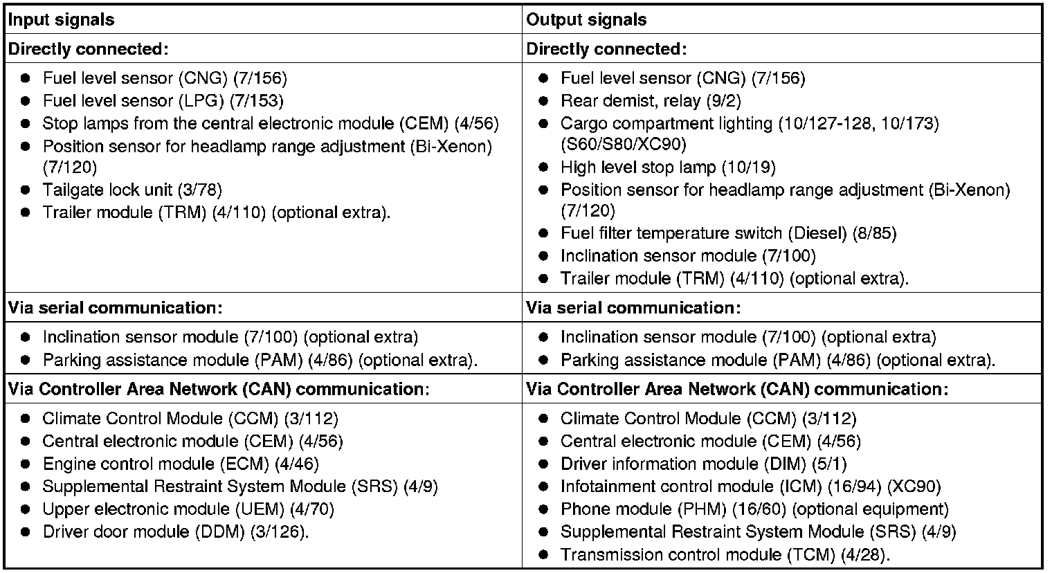 The following table summarizes input signals to and output signals from the rear electronic module (REM). The signal types are divided into directly connected signals, serial communication and controller area network (CAN) communication. The illustration below displays the same information with the Volvo component designations.