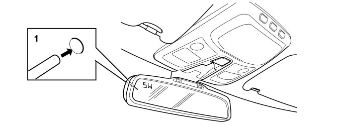 The compass is integrated in the rear view mirror. The compass display is integrated in the mirror glass. The display is a vacuum-fluorescent type. The display luminance is regulated via the internal light sensor in the rear view mirror. When the vehicle is started, all the segments light up in the display. All the segments then go out after a couple of seconds. The display then functions normally. The compass has a button (1) which is used to: