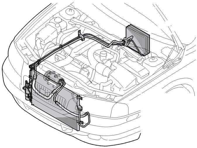 The compressor pumps in hot refrigerant gas under high pressure. The gas has a temperature of between 70 and 110 °C in the intake on top of the condenser. When the hot gas flows through the pipe loop, it is cooled down and condensed. The heat that is removed from the gas during this process is transferred to the surrounding air. The engine cooling fan (FC), which is the same fan used by the engine cooling system, increases the airflow through the condenser. The air flow increases the transfer of heat from the refrigerant to the outside air.