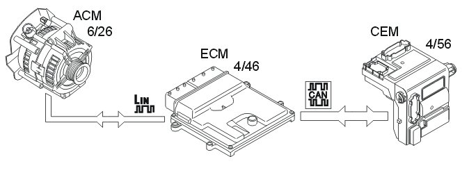 The engine control module (ECM) (4/46) regulates the charge voltage of the generator (GEN) (6/26) (via LIN communication) when requested by the central electronic module (CEM) (4/46) (via CAN communication).