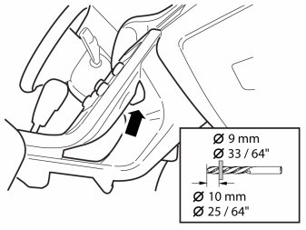 - Drill a -9 mm (33/64") hole in the panel in front of the center console as illustrated. Predrill first using a smaller drill bit. Use a drill stop.