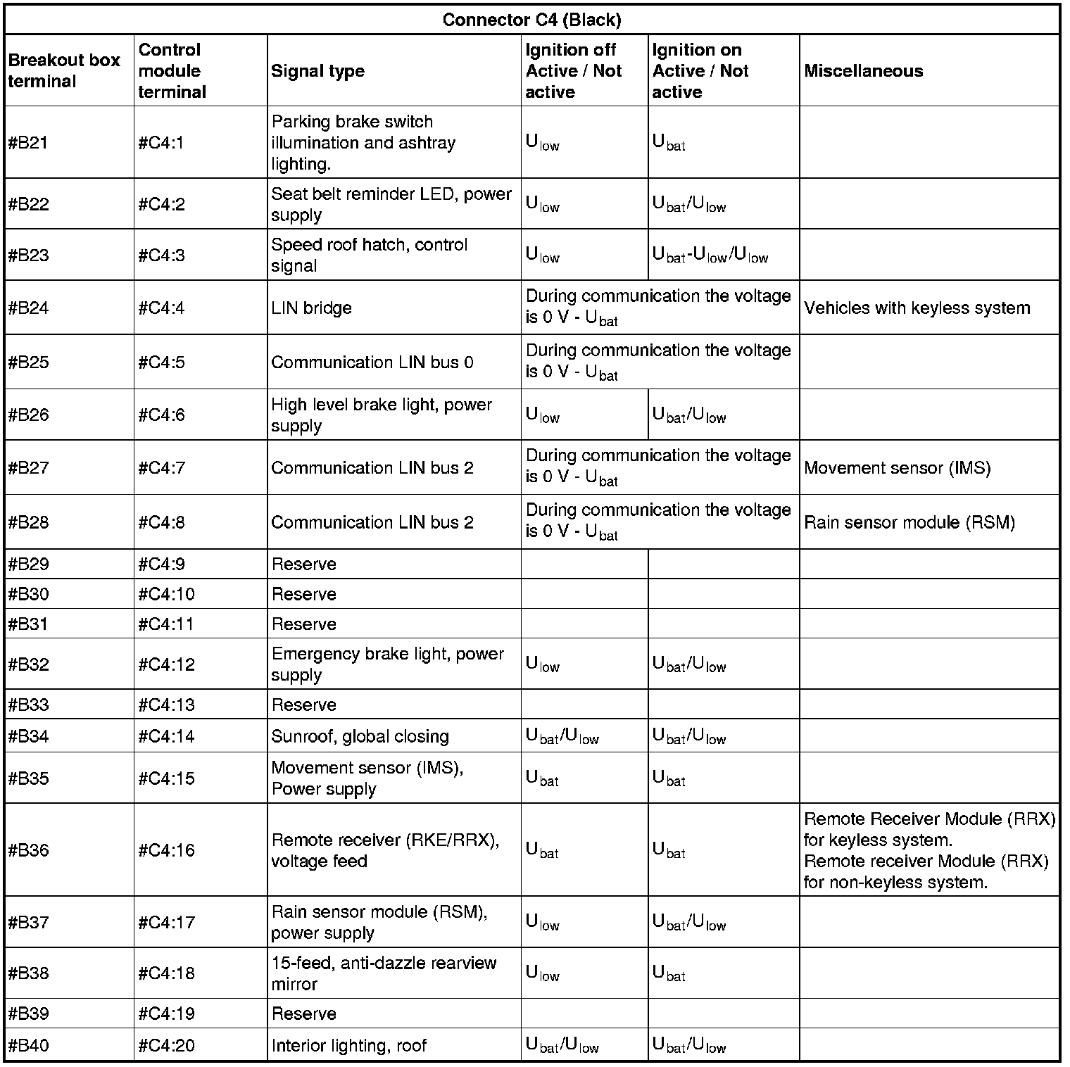 All values given below are between the terminals stated in column 1 and terminal #D5 (power ground). This applies unless otherwise indicated in the last column.