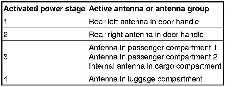 The keyless vehicle module (KVM) contains 4 power stages. The control module uses these relays to select the antennas to be activated. See the table below: