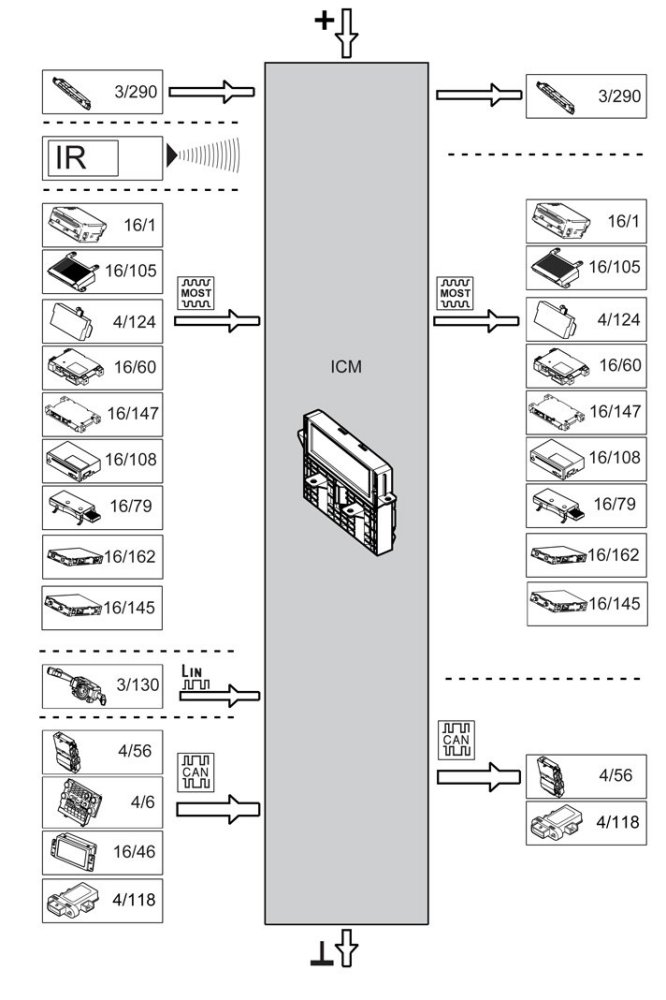 The infotainment control module (ICM) controls functions run on the MOST network via its user interface. The command is transmitted from the infotainment control module (ICM) to the other control modules in the network. These implement the requested functions, for example sound playback, changing sound sources and radio settings.