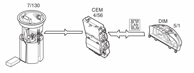 The central electronic module (CEM) (4/56) receives a request to start the fuel pump from the engine control module (ECM) (4/46) via CAN network. The central electronic module (CEM) then activates an internal relay that supplies power to the fuel pump unit (4/83), which in turn powers the fuel pump (6/33).