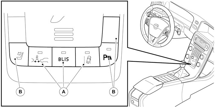 The switches on the lower part of the keypad control optional functions such as "Lane Departure Warning" and active safety. On the latter version of Climate control module (CCM) the switches for optional functions are in turn divided in two groups: the first consists of the three middle switches (A), which are replaceable; the second group consists of the three surrounding switches (B), which are fixed.