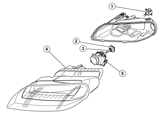 The lamp housing contains a sensor that indicates whether the light beam has been turned out to the right or left. The left headlight control unit (LHCU) and right headlight control unit (RHCU) send this information to the headlight control module (HCM).