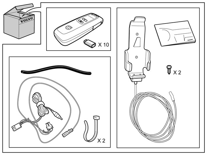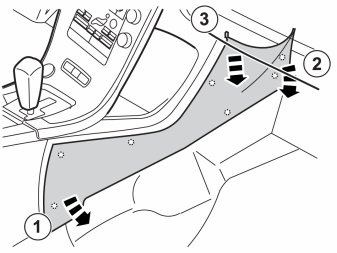 Note! The cradle for the alcohol lock can be positioned either on the thin rubber mat in front of the centre console or on the left hand side of the rear edge of the storage compartment under the armrest in the tunnel console.The thin rubber mat must be purchased separately for cars with the thicker mat.The work is carried out the same way on left and right-hand drive cars, but mirrored on right-hand drive cars. Left-hand drive car shown.