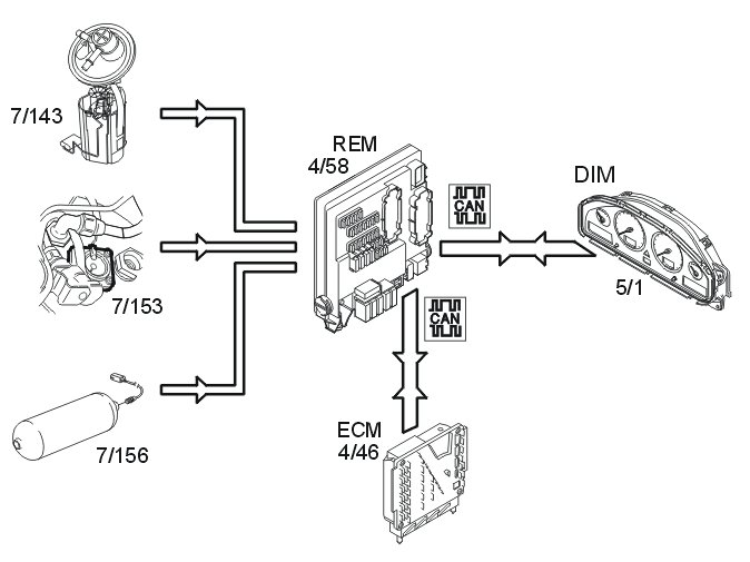 The rear electronic module (REM) receives information via the controller area network (CAN) from the engine control module (ECM) (4/46) indicating that the car should run on LPG or CNG. The rear electronic module (REM) also receives information via the controller area network (CAN) from the central electronic module (CEM) (4/56) indicating the position of the ignition and data about collision status. When the ignition is on and no collision has been registered, the rear electronic module (REM) activates the relay, which supplies the valves with power.
