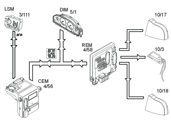 The rear fog lamps (10/46, 10/53) are activated by pressing the button for the rear fog lamps in the lamp switch module (3/111). The light switch module (LSM) transmits a request to light the lamps to the central electronic module (CEM) (4/56) using serial communication. The central electronic module (CEM) transmits the request to the rear electronic module (REM) (4/58) via the Controller area network (CAN).