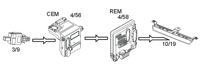 The central electronic module (CEM) transmits the data via the controller area network (CAN) to the rear electronic module (REM) which activates the lamps.