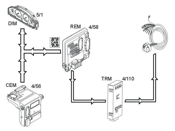 - the central electronic module (CEM) (4/56) transmits a signal indicating the position of the ignition key. The key must be in position II.