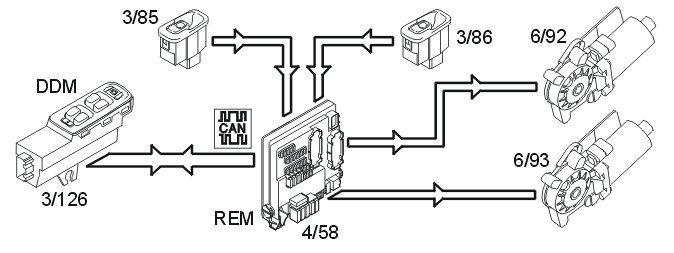 When the window lift mechanisms are operated from the driver's position, data is transmitted from the driver's door module (3/126) via the controller area network (CAN) to the rear electronic module (REM) (4/58) which transmits a signal to the correct relay.