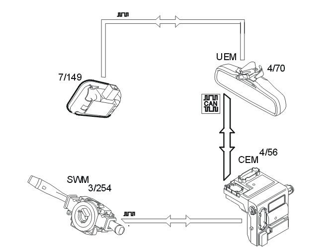 The signal transfer occurs internally in the rear view mirror, and is carried out directly between the upper electronic module (UEM) and the anti-dazzle function.