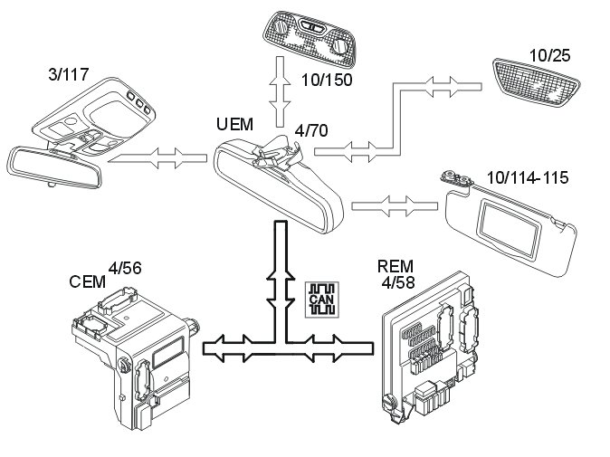 The request for keyhole lighting, courtesy lighting and cargo compartment lighting is sent from the upper electronic module (UEM) to the central electronic module (CEM) (4/56) and rear electrical module (REM) via the controller area network (CAN).
