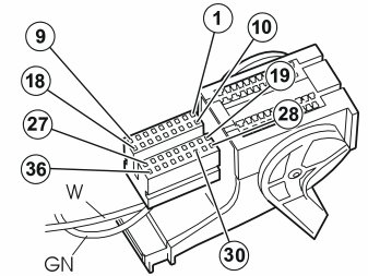 - Connect the green (GN) lead to position 19 in the connector. Connect the white (W) lead to position 30.