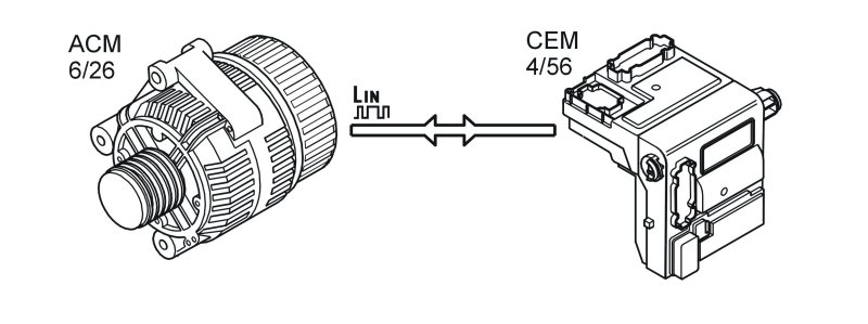 The central electronic module (CEM) communicates with the alternator control module (ACM) via serial communication.