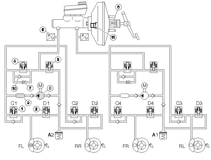 circuit pressure (pressure release, see the left front wheel - FL). This reduces the hydraulic pressure and braking effect, allowing the wheel to