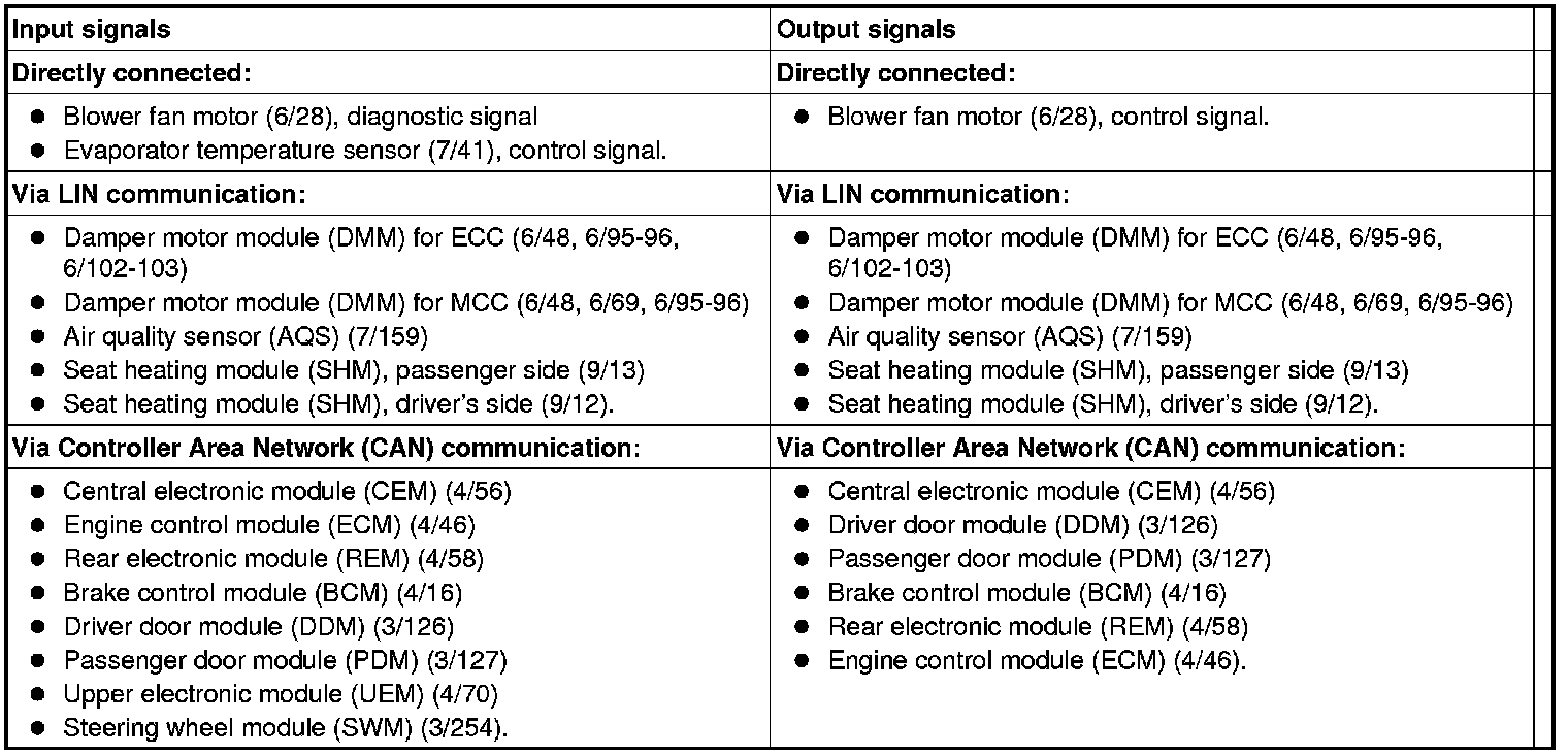 The table below summarizes the input signals to and output signals from the climate control module (CCM). The signal types are divided into