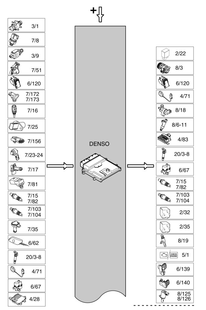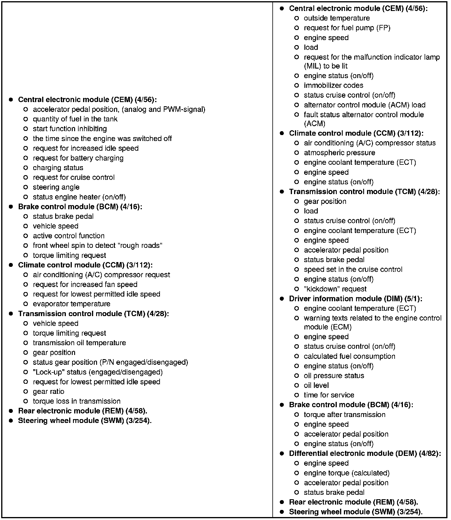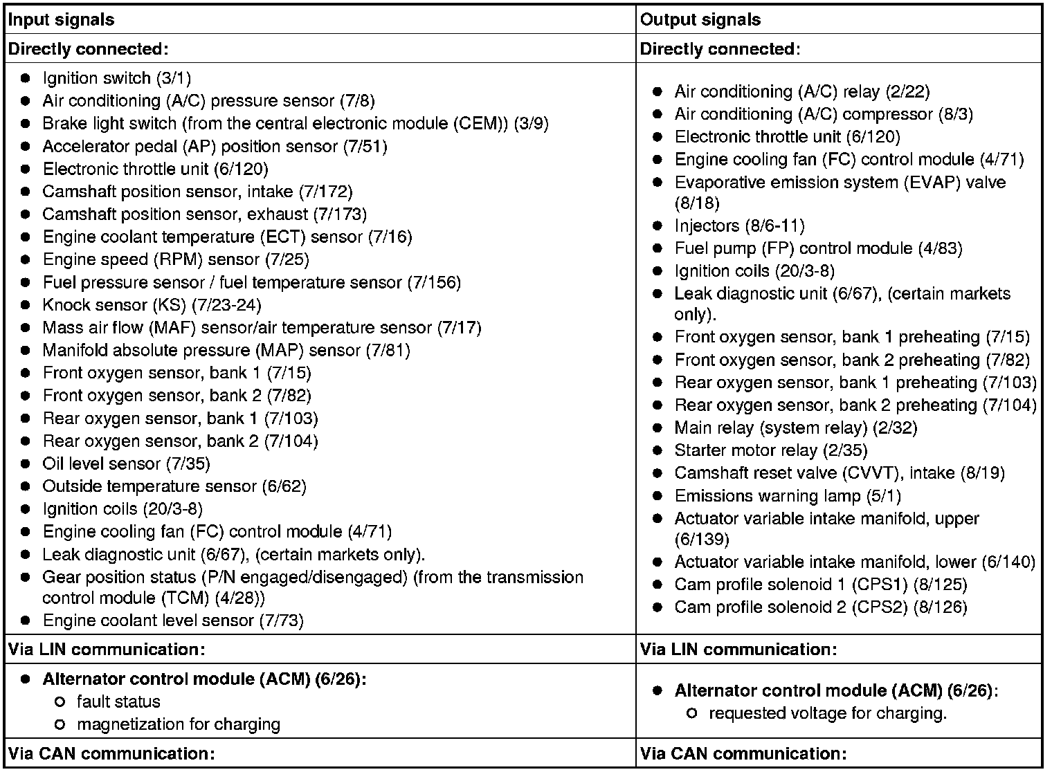 The table below summarizes the input signals to and output signals from the Engine Control Module (ECM). The signal types are divided into directly connected signals, LIN and CAN communication. The illustration below gives the same information as the Volvo component designations.