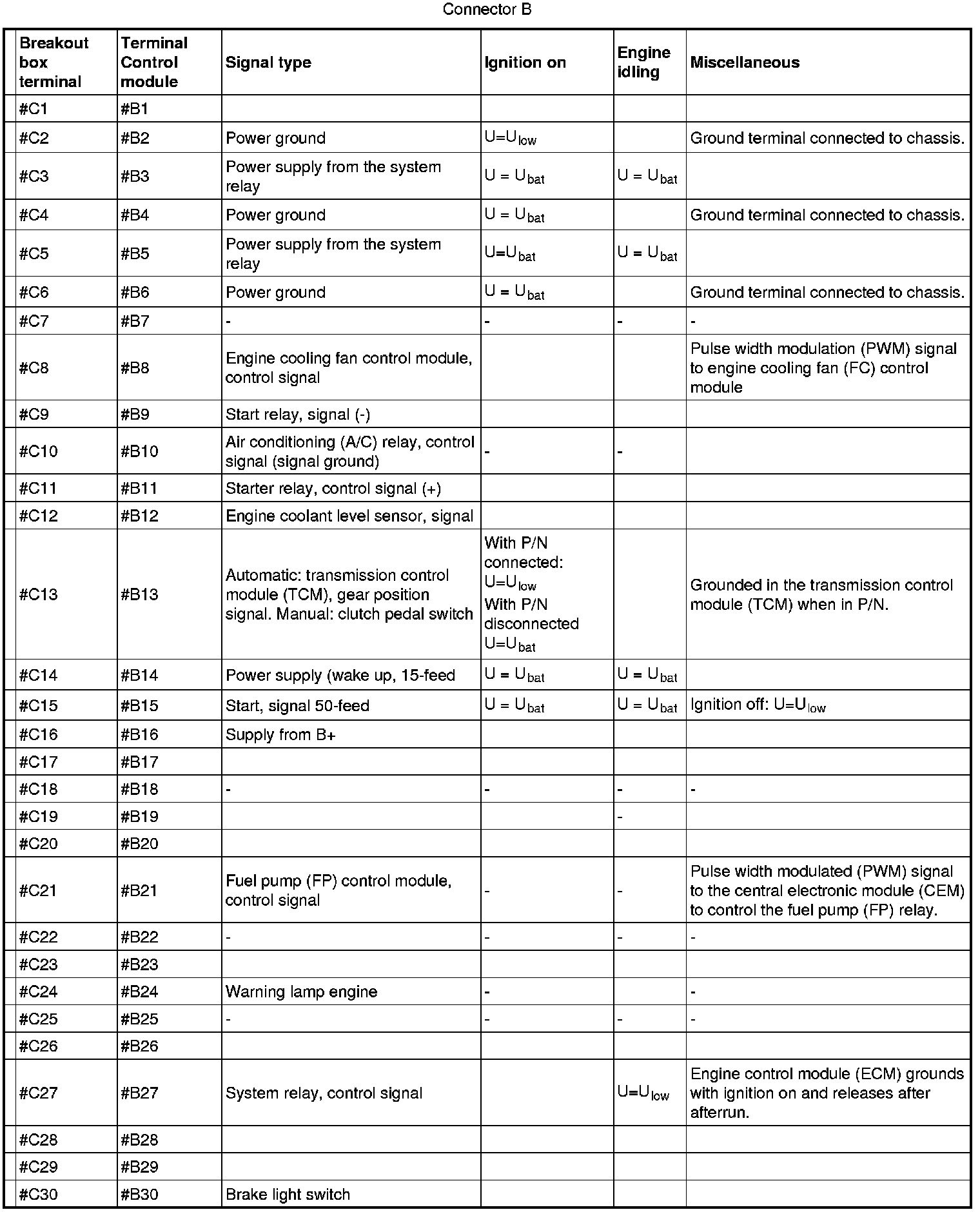 Connector B (58-pin engine side) corresponds to terminals #C1 - #58 on the breakout box.