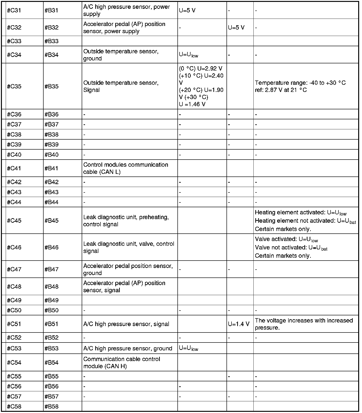 All values indicated below are between respective connection in column 1 and #A C2 on the breakout box. If this is not the case, it is indicated within brackets.
