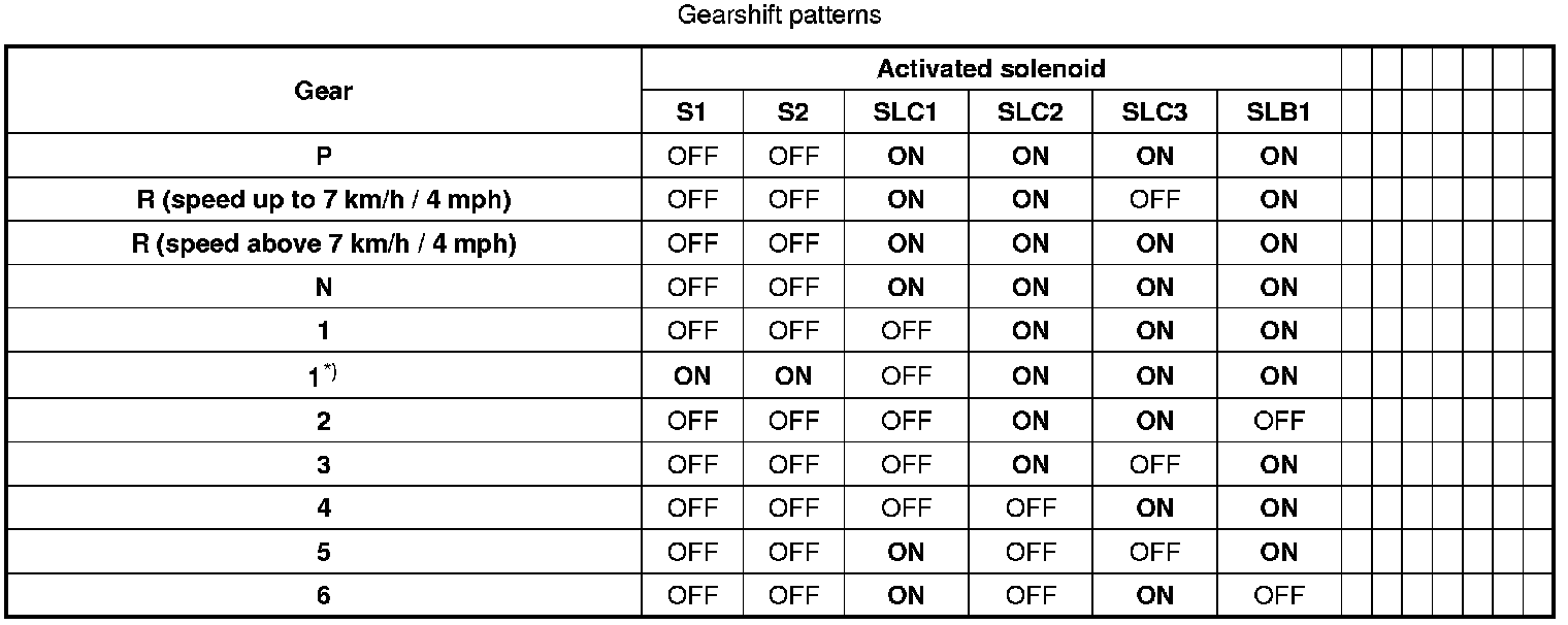 Shifting is regulated by the transmission control module (TCM) activating the solenoids in a specific pattern. The solenoids S1, S2, SLC1, SLC2, SLC3 and SLB1 control which gear is engaged. The solenoid SLC1, SLC2, SLC3 (together with solenoid SLT) also control how engagement occurs by adapting hydraulic pressure. The basic parameters for the various shift points are accelerator pedal position and vehicle speed while shift quality is determined by torque control.