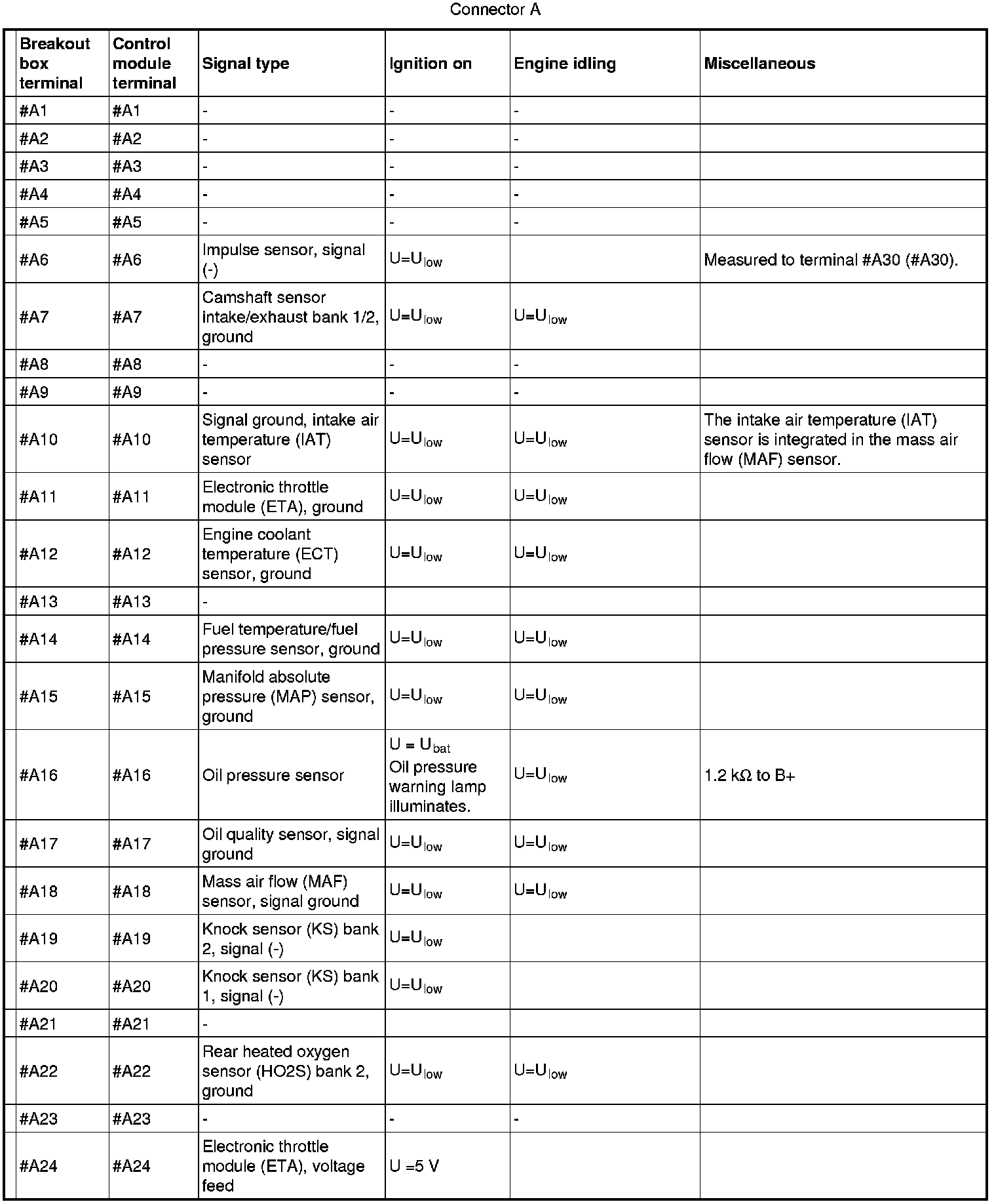 All values indicated below are between respective connection in column 1 and #A C2 on the breakout box. If this is not the case, it is indicated within brackets.