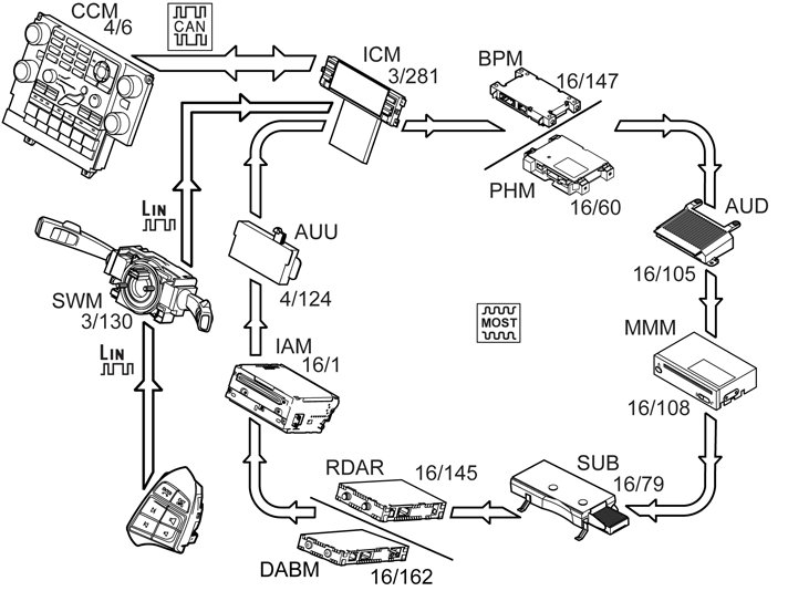 The infotainment control module (ICM) (3/281) is partially controlled by the control module's own keypad and partially by the keypad on the climate control module (CCM) (4/6). The signals from climate control module (CCM) keypad are transmitted via the controller area network (CAN).