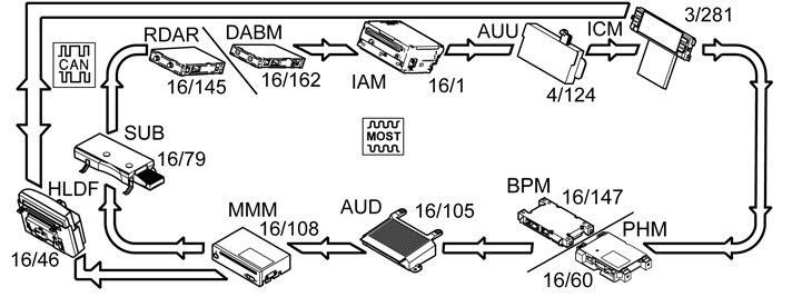 If a control module is not in the stored list, it is disconnected from the MOST network and the functionality of this control module is blocked. This means that control modules in the MOST network cannot be moved from one vehicle to another. This function also applies to the High Level Display Front (HLDF), which communicates with the infotainment control module (ICM) via the controller area network (CAN).