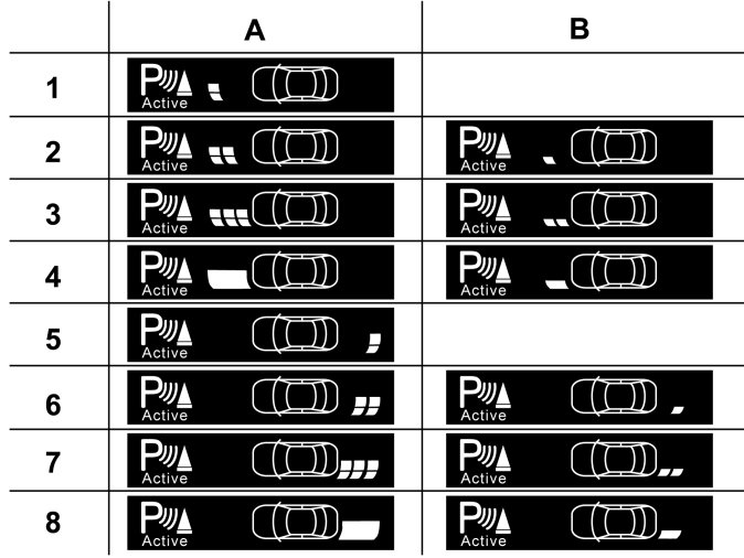 The illustrations in column A show how the inner sensors work. The illustrations in column B show how the outer sensors work.