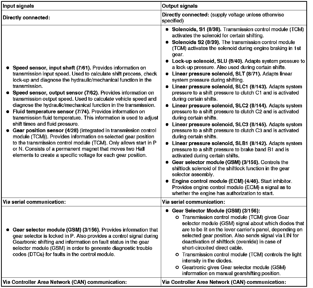 The table below summarizes the input and output signals to and from the transmission control module (TCM). The signal types are divided into directly connected signals, serial communication and CAN communication. The illustration below displays the same information with Volvo component designations.