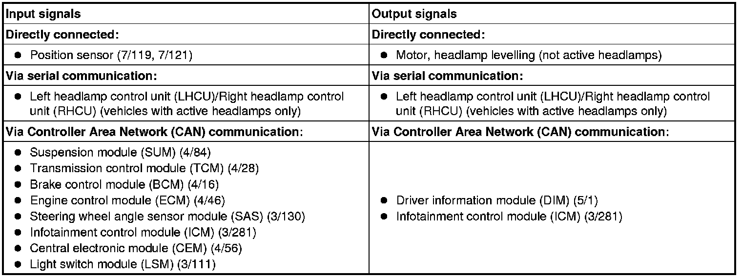 The table below summarizes the input signals to and output signals from the headlamp control module (HCM). The signal types are divided into directly connected signals, serial communication and CAN communication. The illustration below displays the same information with the Volvo component designations.