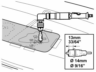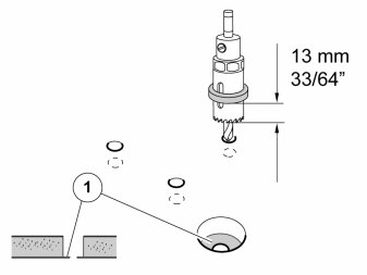 - Drill for the connection of the connector. Drill through all layers of the dashboard. Use a 25 mm (1")drill stop.