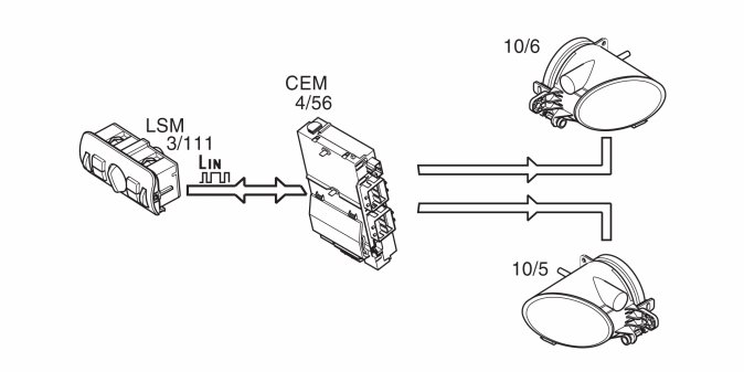 Depending on the position of the knob in the light switch module (LSM) (3/111), the module transmits a request to the central electronic module (CEM) to switch on low beam. Central electronic module (CEM) (4/56) supplies power to the low beam directly via an output.