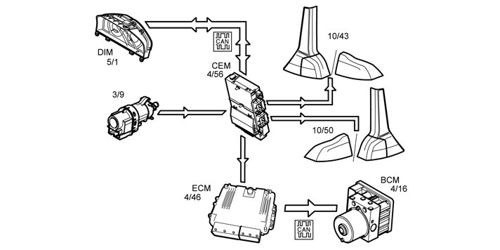 In the event of a fault, the central electronic module (CEM) transmits data via the Control area network (CAN) to the driver information module (DIM) (5/1) which displays a text message.